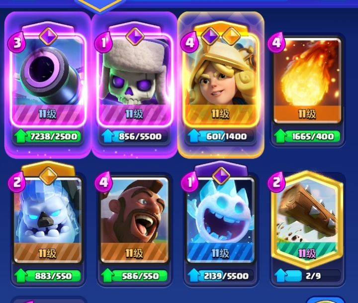 1. 构筑思路:卡组搭配逻辑清晰,采用大小前排+大小后排+大小法术+1建筑+1进攻的固定配比;大小前排为冰人+骷髅,大小后排为火枪+冰豆,进攻牌为野猪,建筑为核心守场牌。