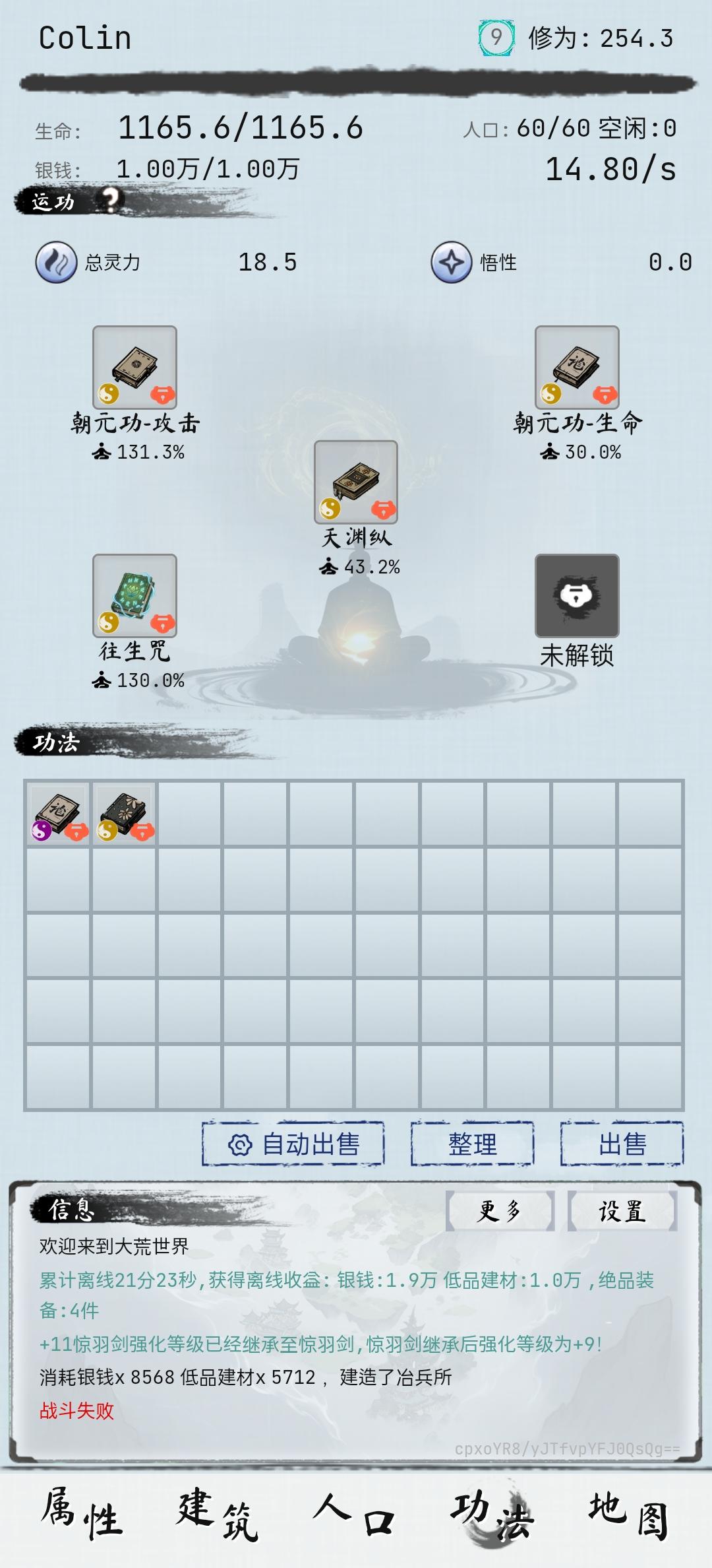 2-9往生后优先加攻击,然后开装备,灵根(属性攻击增伤8%),幸运(加快刷装备速度),劳工居所,祠堂,武卫营