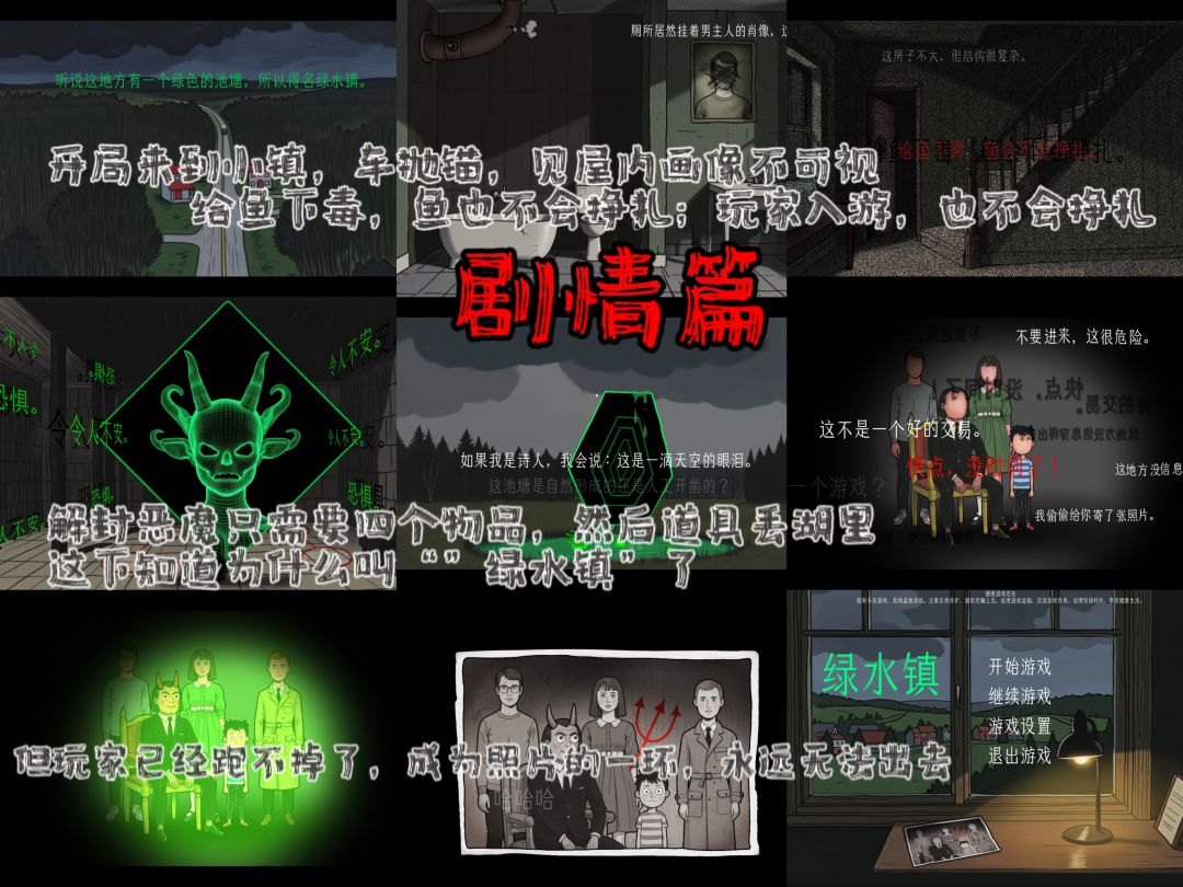 剧情的开头是玩家通过一张照片,来到一个名叫绿水镇的地方,路上经典剧情开车抛锚,但不影响主角作死还是进入了其中,发现小镇的水并非是绿的。