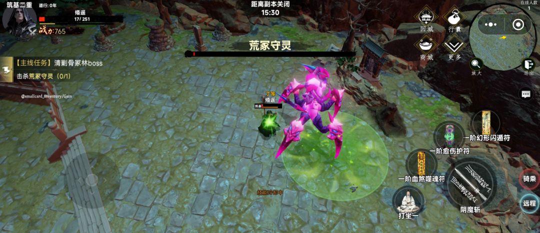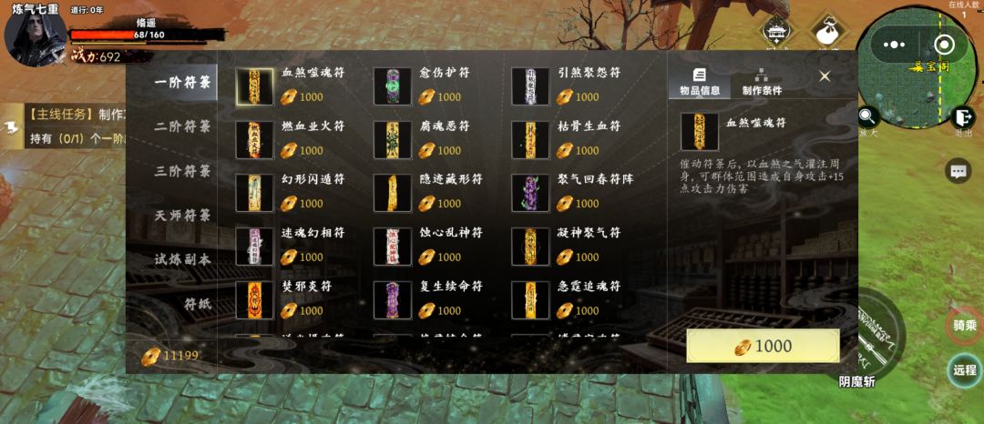 不一样的修仙玩法,道士符箓玩法,可以打坐挂机,早期按主线任务可以合成血煞和愈伤符输出回血,新手保护期可以无限复活刷boss