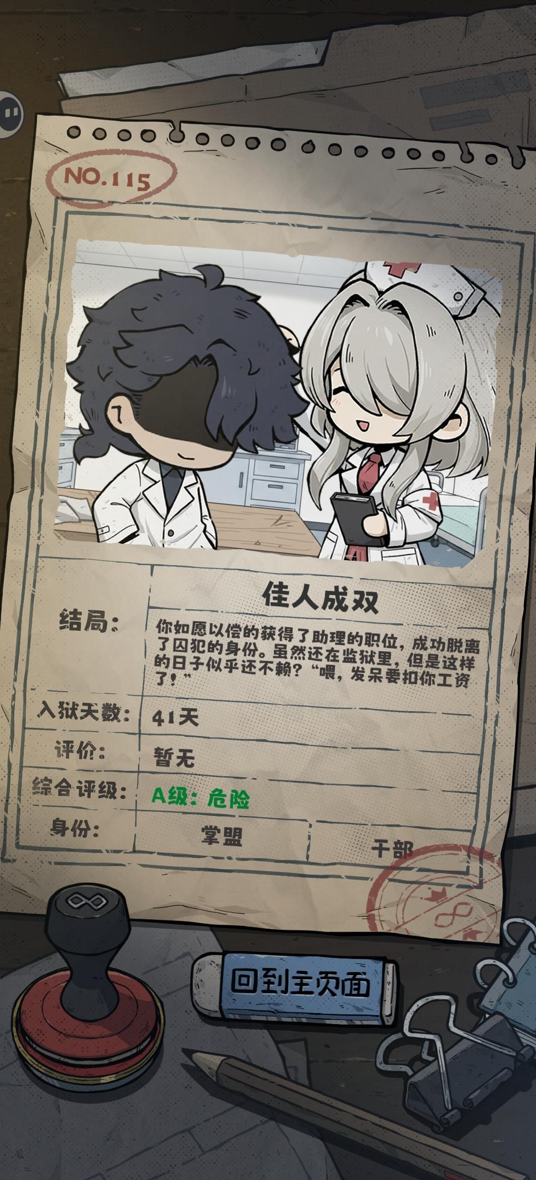 这游戏确实很好玩,目前通过方法我感觉最难的就是暗影之王和医学助手,暗影之王需要的材料需求量很大,和浣熊200亲密度完,20级帮派后7天内要求100积分兑换券给狱卒,100张紫色餐卡给兔子,50绷带给老虎,主要是7天内凑齐时间有点赶,特别是第一次触发剧情,不知道要求这么多,没提前准备很容易失败(顺带一提,老虎挺仁义的,给整到200多好感度每天豪华餐票给三四张,吃的就不愁了,钱可以用到别处),然后是医学助手(也叫佳人成双),这个也挺难的,和医生200好感度就可以触发了,也是7天结算,那个兔子不是什么好人,一本医学书卖1000分,+1%的进度,还得扣5理智,给整满好感度也不打折,索要也不给,兔子最好的就是给上贡卡,失败了好几次,都是差一点通关,总结就是,你要达成这个结局,你得去玩股票,大概10w积分能搞到100%医学知识,玩股票就选择加杠杆之类的福利,然后不要贪,不然功亏一篑,我几w积分一秒没,还没得回档,只能重玩,除非你晚上睡觉之前看纸条,你要选消息纸条才有可能有那个股票涨落的消息,福利纸条是只给东西的,有确切消息再全部梭哈,切记!切记!不要贪,不然很容易一秒亏没!!然后我个人感觉最简单的就是掌盟之主了,前期和狗老虎到40好感度就可以进掌盟了,然后给掌盟任务做一做,所有掌盟的人到200好感度,再给狱卒整点积分兑换券,这个任务没有时间限制就挺简单的,然后可以通关了,还有个举报结局的,和医生到120好感度给她捡到纸条,就可以打电话了,也是收集兑换券给狱卒,然后偷典狱长身上的账本,因为只有一次机会,你得提高偷东西熟练度,就只能拿别人练练手,掌盟狗老虎会打人就最好别偷,其他人都都可以拿来练练手,但是所有人都会讨厌你,懂吧,hh想试试也可以去试试,其他结局我打通了再补充![[表情_开心]](https://img.tapimg.com/market/images/48516f625646b5ea2c66f0cab3c9c52a.png)