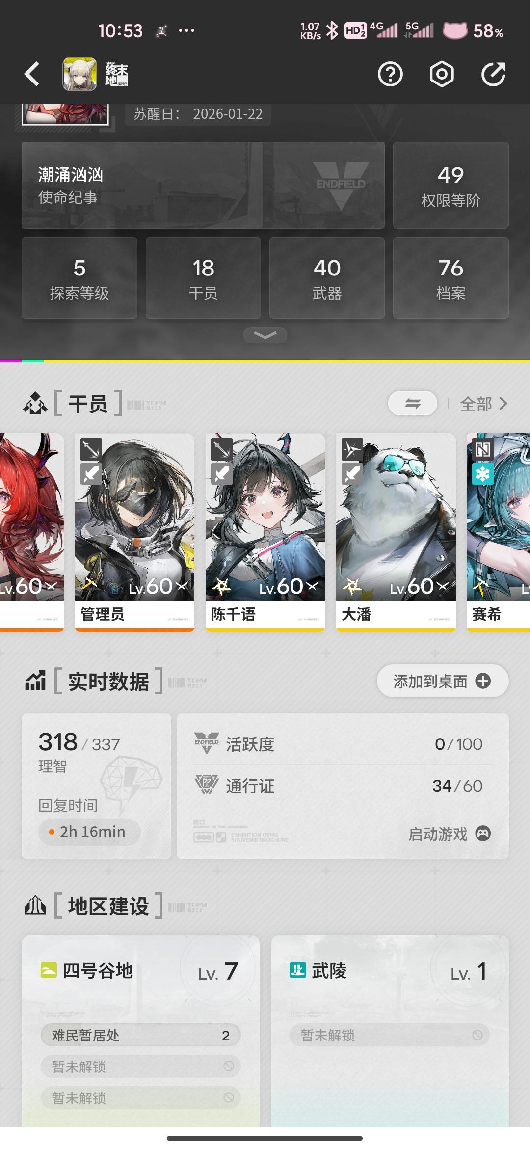 首先作为方舟117的老登,可以说终末地这游戏我是期待很久了网上那些人老是说这游戏很肝,确实,他前面那几天刚开始玩有点上头,确实比较肝,因为谁不想尽快拿满40抽抽出个六星?但是到了一月二十六,你们也可以自己看,我平均一天四小时不到,但是昨天也已经到武陵了,我这种就已经算慢的了,一天三四个小时也不算赶吧,就前面那几天把基础的基建拉好,然后把材料放上去,剩下的全部抄蓝图机器我也搞不懂,但是它1月30号优化了一下,模拟空间的都可以跳了,直接拿奖励,然后直接去抄大佬的蓝图,