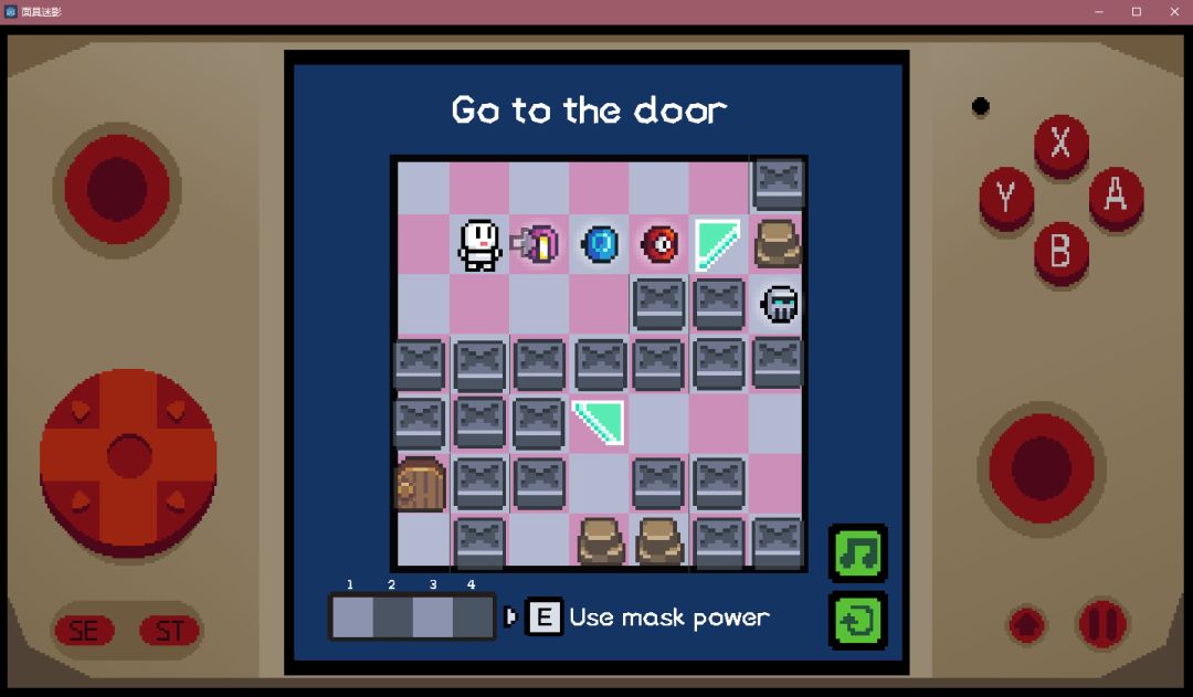 2D像素画风,界面只有这一屏,四周UI看起来像游戏机一样,带有一种复古的感觉。小人造型比较可爱,有简单的移动动作,戴上面具后完全遮住了面孔。不同面具的技能特点鲜明,效果与面具造型也有一定关联性,比较好记忆和一一对应。