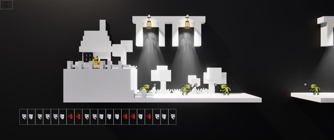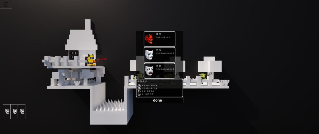 总共只有几个关卡,前几关只有三个面具可以发射,若没消灭光敌人就只能重新开始。最后一关敌人站位较远,要拉远一下视角才能看到,给的面具子弹也多。全部通关大概十分钟左右,会因操作和适应产生少许时间偏差。