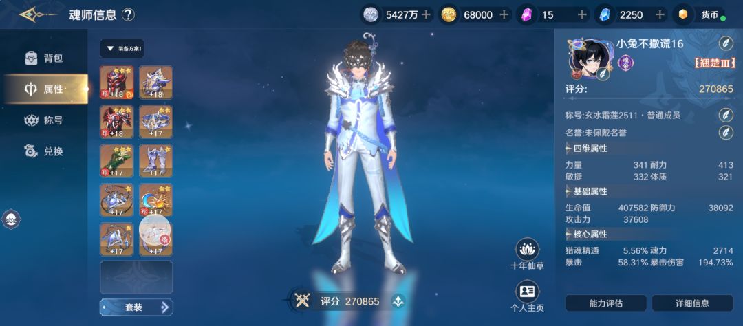 家人们,纯零氪玩《斗罗大陆:史莱克学院》,71级终于把常驻池9个SSR抽满了,史莱克核心队(戴沐白/马红俊/宁荣荣/奥斯卡)全成型,主C评分直接干到27万,暴击率58.31%+暴伤194.73%,装备也基本拉到+17~+18了,放几张截图给大伙康康