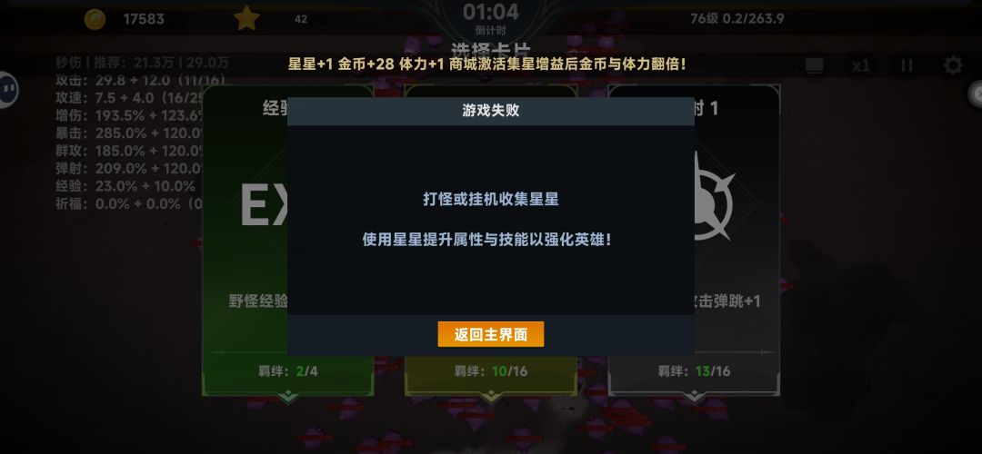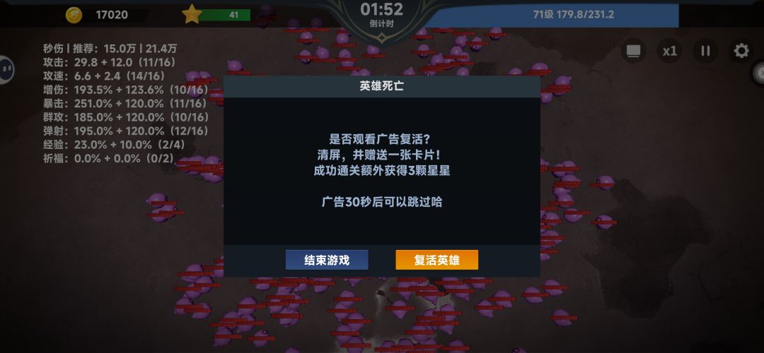 玩了快两个小时,第一关都还没过去,还是没玩明白,太吃运气了。本来截图是想着终于要过第一关了,告诉兄弟们不用选祈福,纯浪费,经验也能不选就不选。这把是我坚持最久的一次,真的,作者就好像生怕我通关一样,退游了。