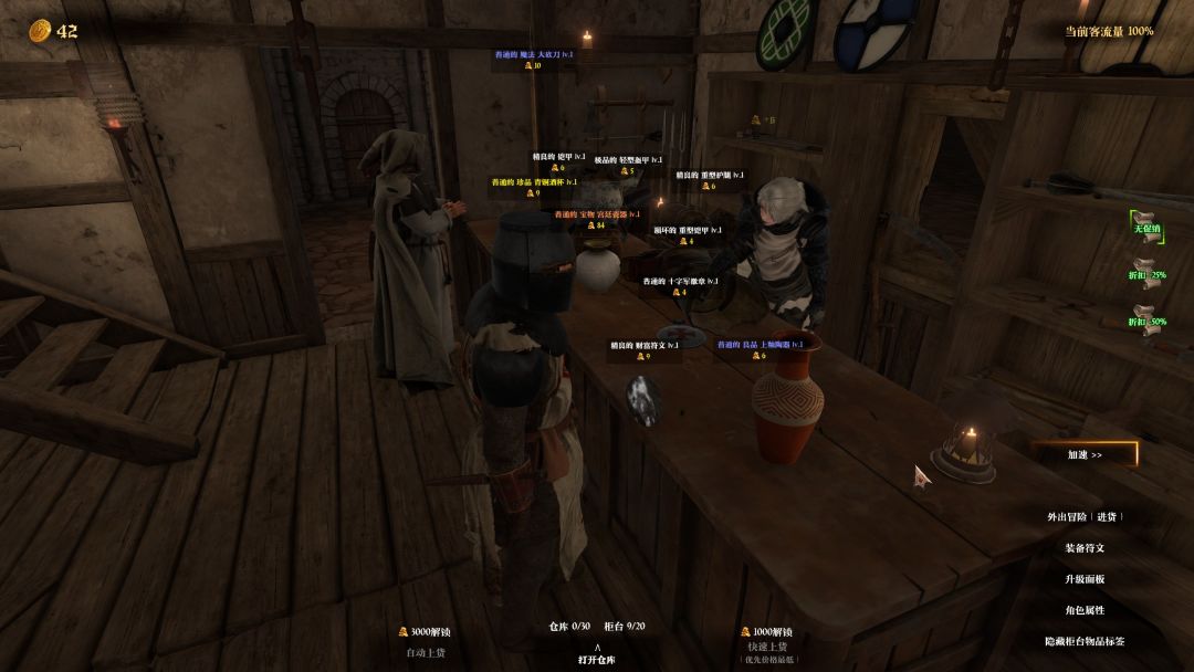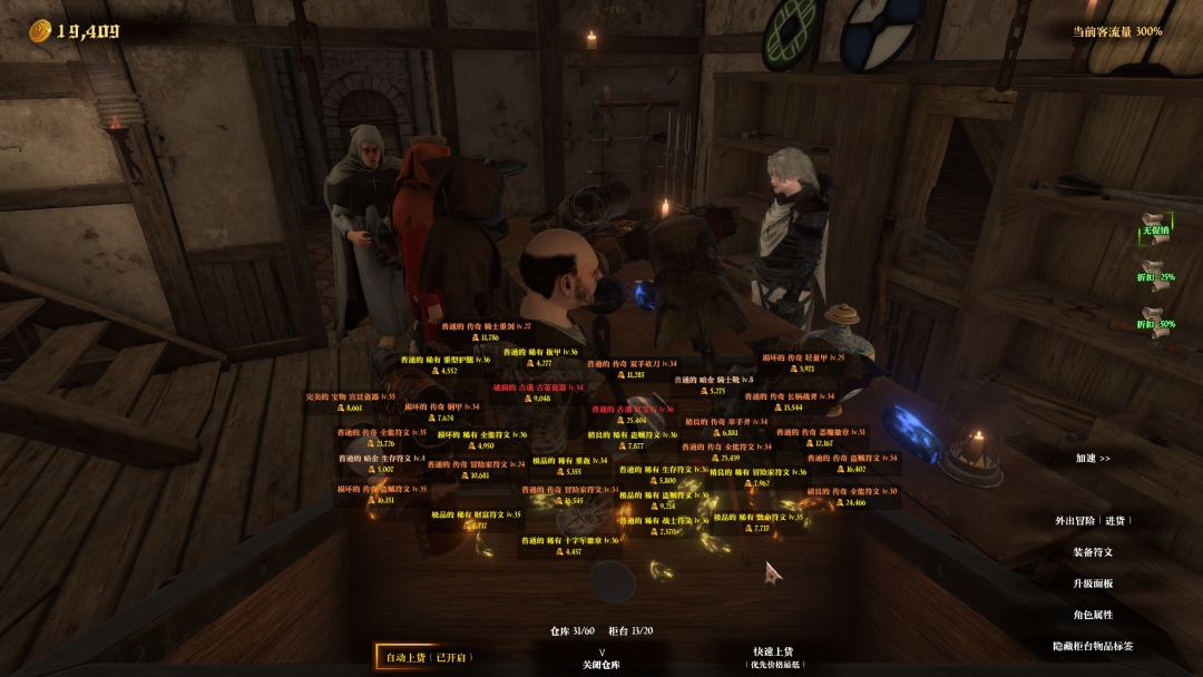 随着副本难度的推进,在后面我们的装备会爆仓!所以是很有必要花1k金币解锁一键上货以及3k金币的自动上货的~能更加轻松省事,不用一件装备一件装备自己添加。爆仓但是桌面能出售的仅有20件,对此可以选择薄利多销(不过没有进货成本就是),通过选择打折的幅度,可以提高客流量~令商品更快的卖出。