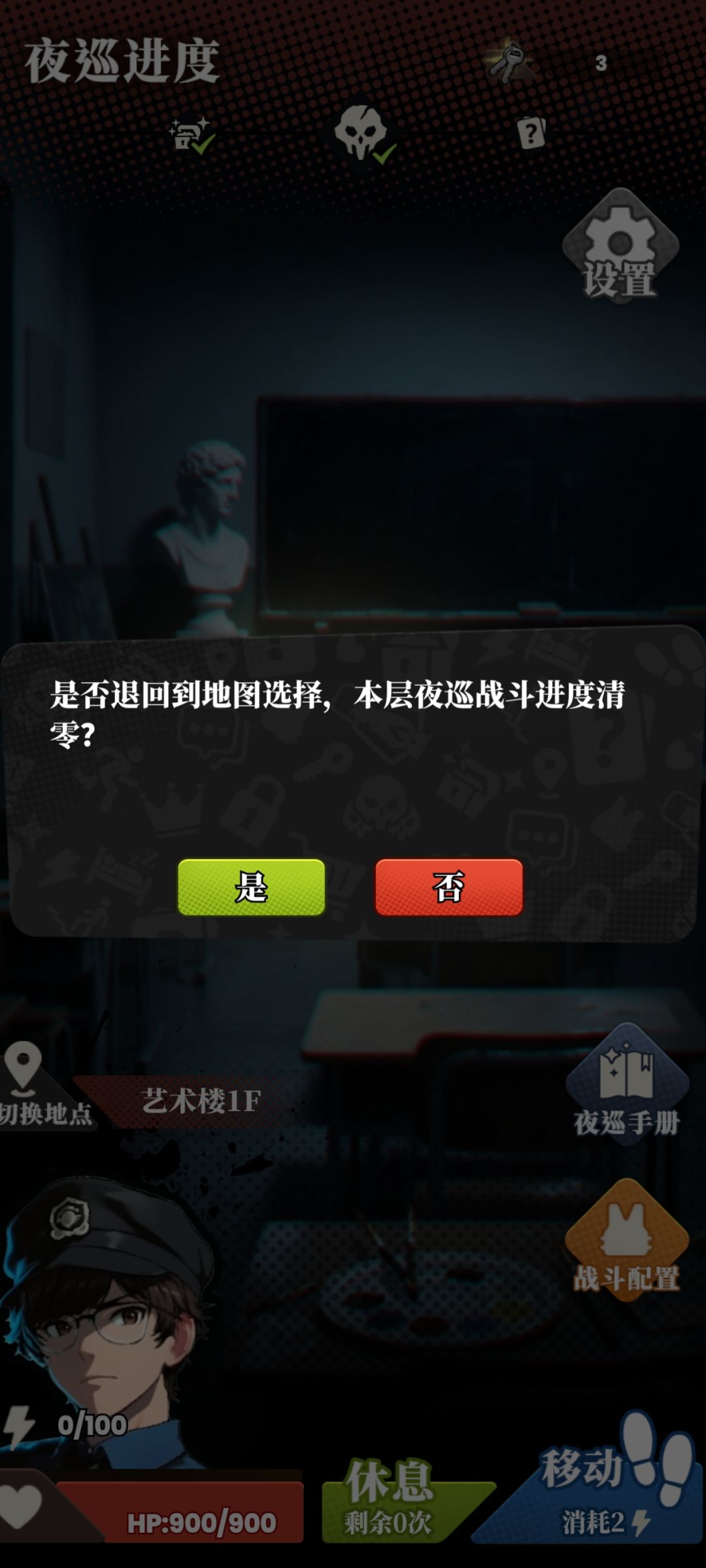 3.说起个人数值和怪物的差异 又说到战斗关卡接连不断以及广告机制 那就肯定离不开战败后的选择 也就是放弃或看广告复活 是的 你没想错 你只能硬着头皮上 一遍遍重复枯燥的战斗和无尽的失败 但你没有办法 因为如果在战斗期间逃跑 再往前走还是需要面对 同时你想在巡逻期间切换地图直接回寝室休息?进度也直接清零 体力100 往前走扣2 刷新自己的装备扣1 回一半的体力我记得也是2(不包含护盾值)总之你想在自己筋疲力尽情况下再回去员工宿舍休息我觉得这期间慢慢就变成了折磨和枯燥 我一层楼下来都不知道得看多少广告💔