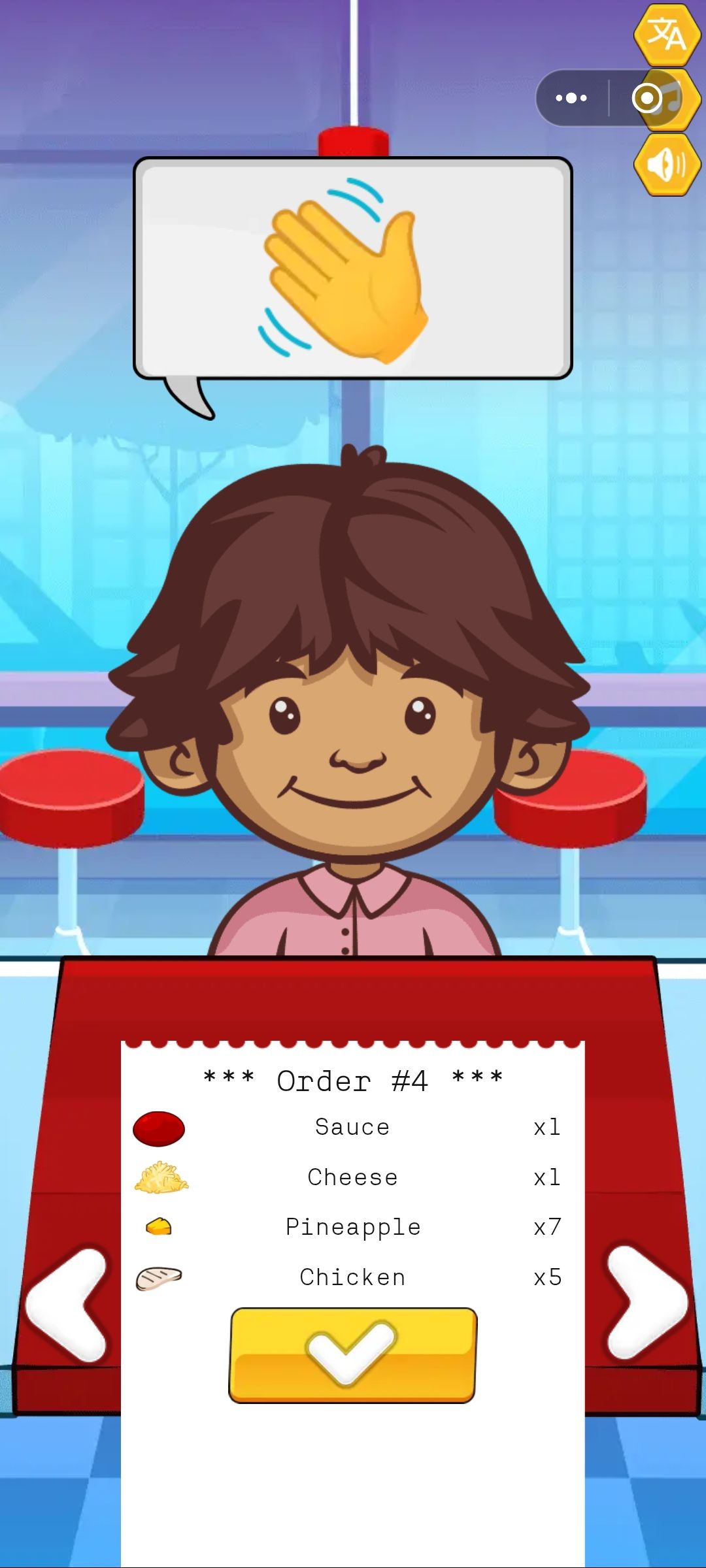 2D卡通画风,界面结构简单,UI品质较好。语言默认英文,可以通过右上角切换成中文。顾客形象很丰富,具有欧美游戏角色的设计风格,看上去很可爱,有简单的五官动作和表情包,意思表达比较准确。披萨制作过程很形象,动态效果模拟得很形象,具有观赏性,也与现实世界理解认知相同。