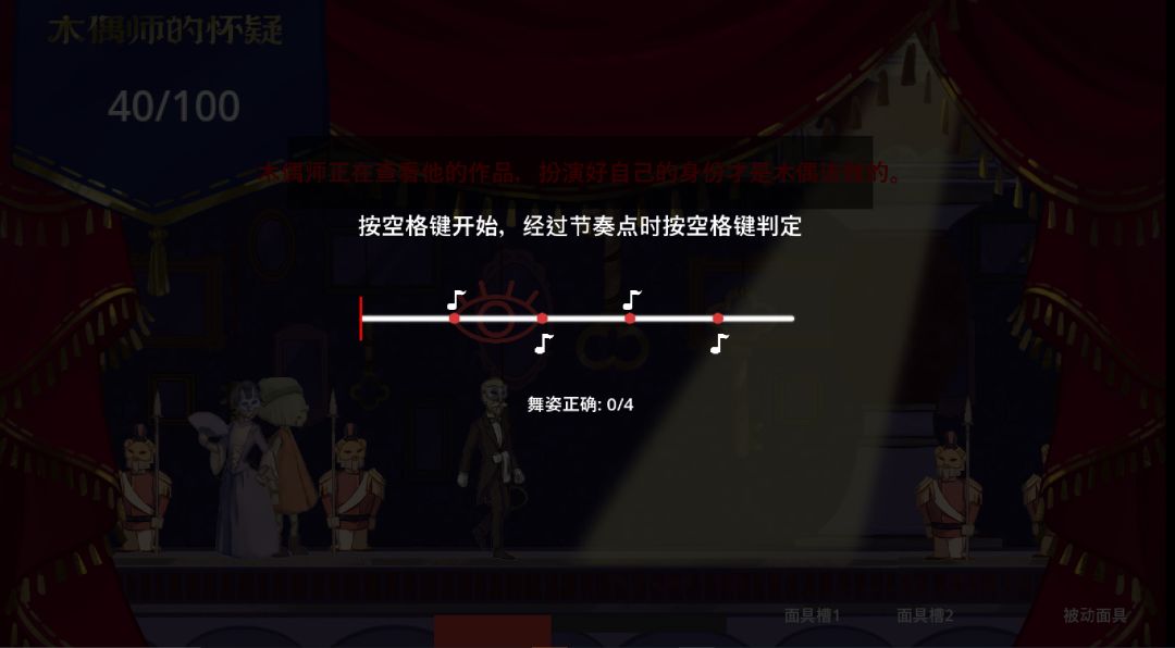 可以刺杀的木偶一共有四种。前文就有提到有睁眼可以继续行动的管家和不增长怀疑值,但是无法行动的守卫。除此之外使用舞者面具,然后进行类似音游的判定精准猜中舞步可以降低木偶师的怀疑值。公主面具则是被动效果,当小木偶在聚光灯下被发现时,公主面具会被自动消耗。小木偶逃过一劫,但是之后木偶师的怀疑值增长速度将会加快。公主木偶是最稀有的。