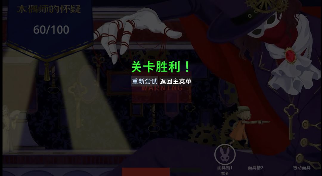 木偶师并非毫无防备,他会随时睁眼观察自己的作品。在他睁眼前会有半透明红色背景的WARNING预警示。然后马上会有红色的眼睛在屏幕上左瞧右看。在他睁眼观察之时扮演一动不动的小木偶才是我们应该做的。除非你能带上管家面具。但是其实也不缺这一点睁眼的时间啦。游戏没有时间的限制,只有满值为100的怀疑值系统。怀疑值满了,木偶师察觉到了小木偶的刺杀计划那就完蛋了。小木偶会被残忍的销毁处理。