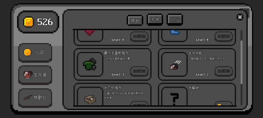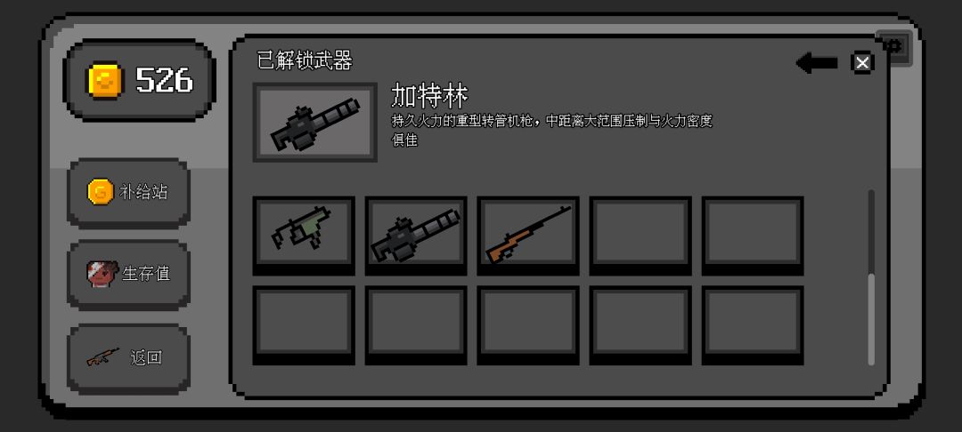 天赋只需要,武器换弹不减速,受伤不减速,道具栏只需要吸铁石,加特林350发子弹,配一个穿透弹头,聚集尸群就一键扫荡,前期可以用喷子(冲锋枪,步枪)过度,商店优先购买各种加成:速度>道具范围>视野>血量 道具:吸铁石>回血类道具 还有一个很重要的事就是,装备了配件的武器不能售卖,所以开箱子之前,空出一个武器位,目前版本就是这样,缺点也有不少,希望论坛的评论作者会看