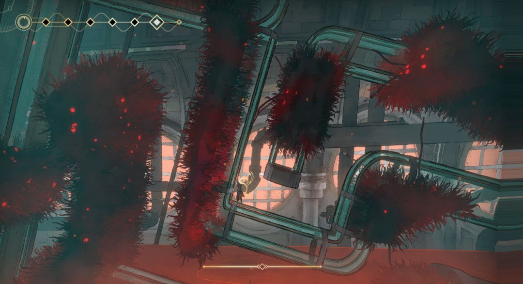 既然什么都记不得了,那么我们肯定要学会如何在这片充满危险的神秘区域中生存下去。本作与其他同为动作银河城游戏的基础逻辑类似。我们需要自己一点点地摸索,在独自去面对这些未知的危险,注意在本作中我们的血条机制并不是数值类型,而是采用了个数的方式,十分有限的爱心颗数,每一次受伤都会损失一颗,这让整体的游戏难度提高了不少,光是在前期中的很长一段时间,都只能保持较为稳妥的策略,在宽阔的大厅附近进行探索,收集资源为大厅中的机械智能体恢复能量。也是在这段时间中,我们发现有关于这个区域背后的故事,这其中到底发生了什么,我又在这其中是一个怎样的存在。