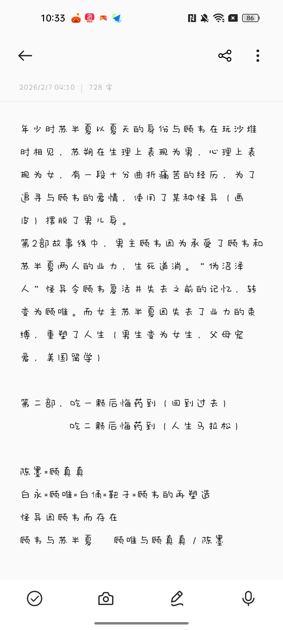 这是一个十分复杂且充满刀子的故事,具有多重结局和多重支线,执着的想着心爱的人,最后落得让你怀疑的结局。情节结构充满反转,身份之谜绕来绕去,万万分之一的计划,跨越三年的时间线,后悔药与蝴蝶效应,都是本作的一大亮点。本人开始玩时,从头到尾做了大量笔记,删删改改到最后才恍然大悟。往往刀子上都是撒糖的,这也是本作被称为“抑郁·绮谭”的原因吧这张纸改来改去,这反转强度给我带来了小小的抑郁震撼。可能有许多不对的,仅供参考