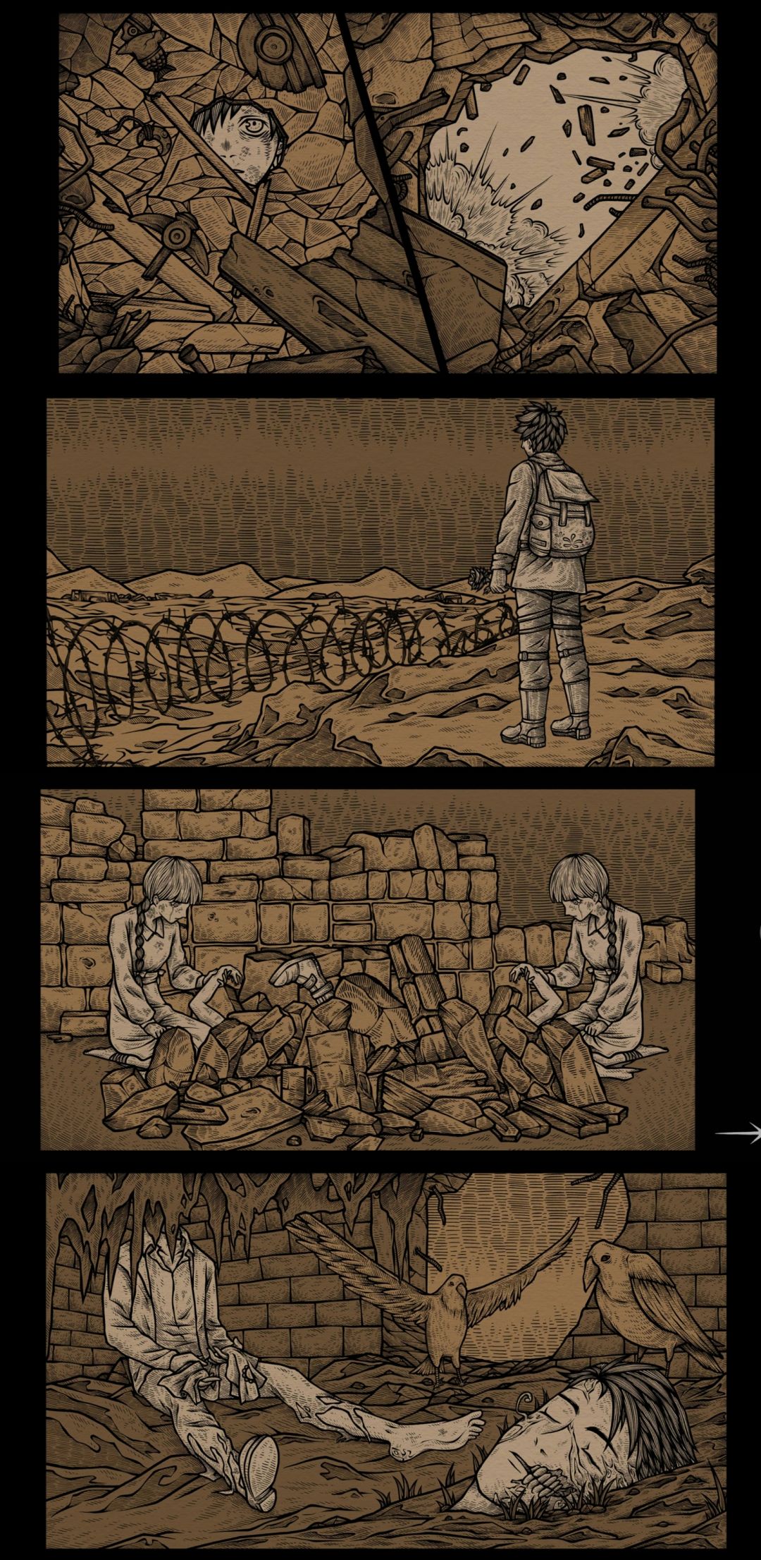 整体其实比较偏意识流,插画什么的表现力和独特风格暂且不提,没有文字的纯图片展示则恰恰凸现放大了其画面的巨大冲击性。在惨痛的悲剧面前,任何语言都是苍白的,只有无声的默剧一般的悲哀在蔓延。最初看来面目可憎的怪物们(追逐战的时候把我吓够呛哈哈哈哈 还好不是很困难不然我这种胆小菜鸡可能会弃游hhh)其实也都不过是战争和人道主义毁灭带来的恶果。感触最深的是那个背着弟弟的长腿怪物,第一次碰面的时候真的吓我一跳,可是后面了解了他们的故事,听着他说“感觉弟弟的回应越来越弱了” 就不免觉得一阵心哀……他们又何尝不只是孩子呢