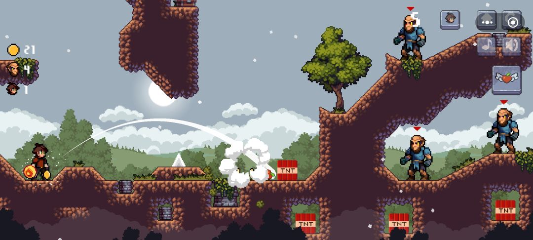 2D像素画风,色彩比较丰富,场景结构简单,UI品质同小游戏。角色造型都是骑士风格,存在少许衣着差异,到不同阶段才能看到明显外观变化。苹果打击效果和愤怒小鸟很像,场景中有一些可以利用的道具,特效意思表达准确,没介绍也能很好理解。