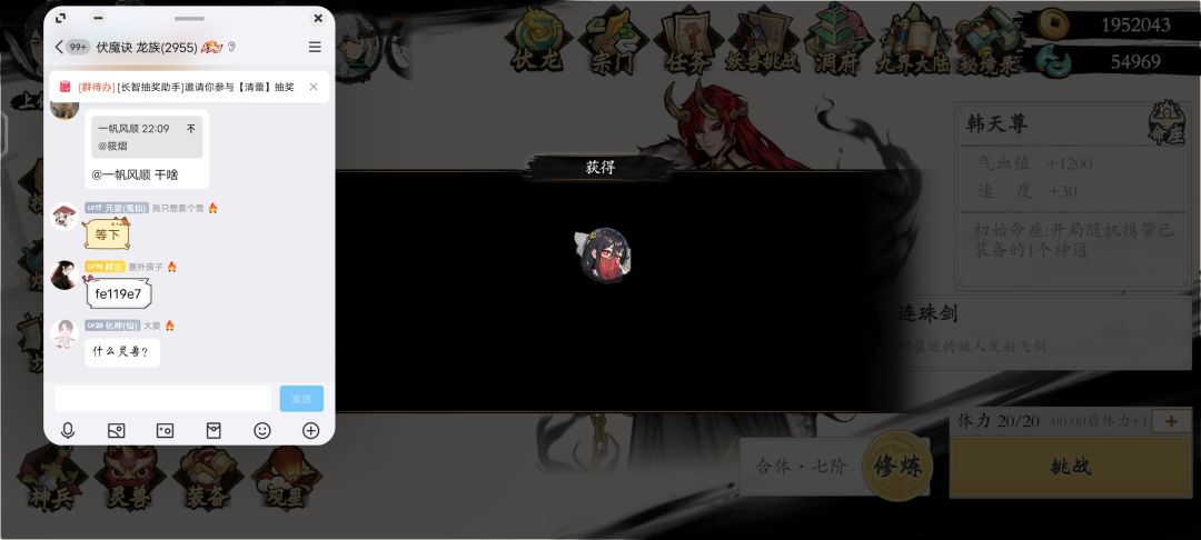 又玩了一段时间了,越玩越上头,最近在洞府疯狂炼丹种菜。因为一开始就相中酷炫的雨字决的缘故,最近攒瓦白嫖换了韩天尊,体验了一下,只能说不愧是我辛苦攒瓦换的,完全就是雨字决特化角色!太爱了,打妖兽挑战也能随便越级击杀boss了。另外快五一了,希望有更多的活动😁