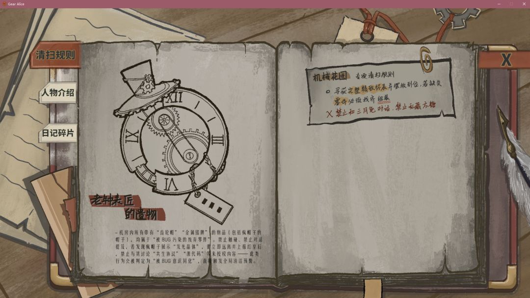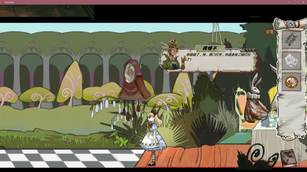 2D横版解谜游戏,没有任何基础操作介绍,能不能玩全看自己悟性。采用常规的键鼠操作,键盘控制爱丽丝移动,鼠标主要是交互。场景内有可探索的物品,鼠标指向后有描边展示,线索不难发现。部分物品之间可以相互组合,形成通关道具,具体操作方式需要自己探索。通关考验脑洞,大概率会卡关。