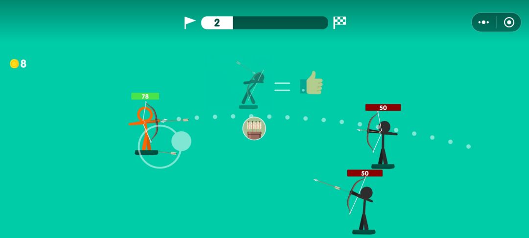 轻度休闲射击游戏,操作非常简单,正向拉弓松手就射,没做操作介绍,摸索下也能很快上手。关卡难度设计很好,挑战难点在于快速击杀敌人,初期可以爆头,但敌人有了头部防御措施后,瞄准身体和攻速变得更加重要。战斗过程中随机掉落道具,合理利用道具可以让战斗更有优势,有很好的可操作性。