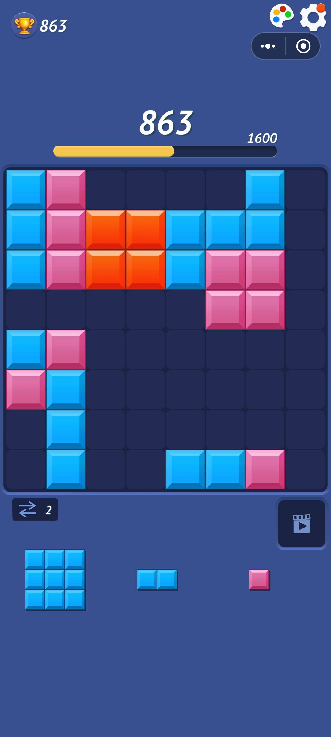 纯2D界面结构很常规,UI品质同小游戏水准。不同方块种类较多,摆放位置相对自由,有些体积庞大,消除需尽量优先能消除的。连续消除有combo,可以增加分数获得量,表现层爽感还可以。