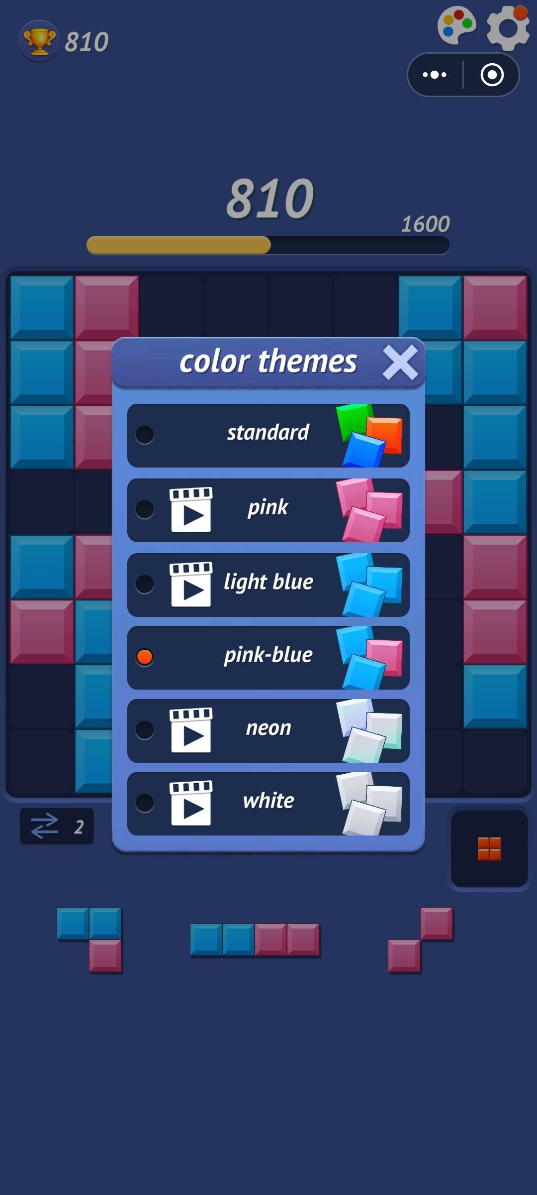玩法模式分无尽和宝石消除两种,无尽内容就是很常规的消除。宝石模式则需要消除目标颜色的宝石,在方块中随机出现不同颜色宝石,消除有方块选择策略。两个模式都有一个空槽位,可以临时放置一个方块,让手动操作的容错率有提升。