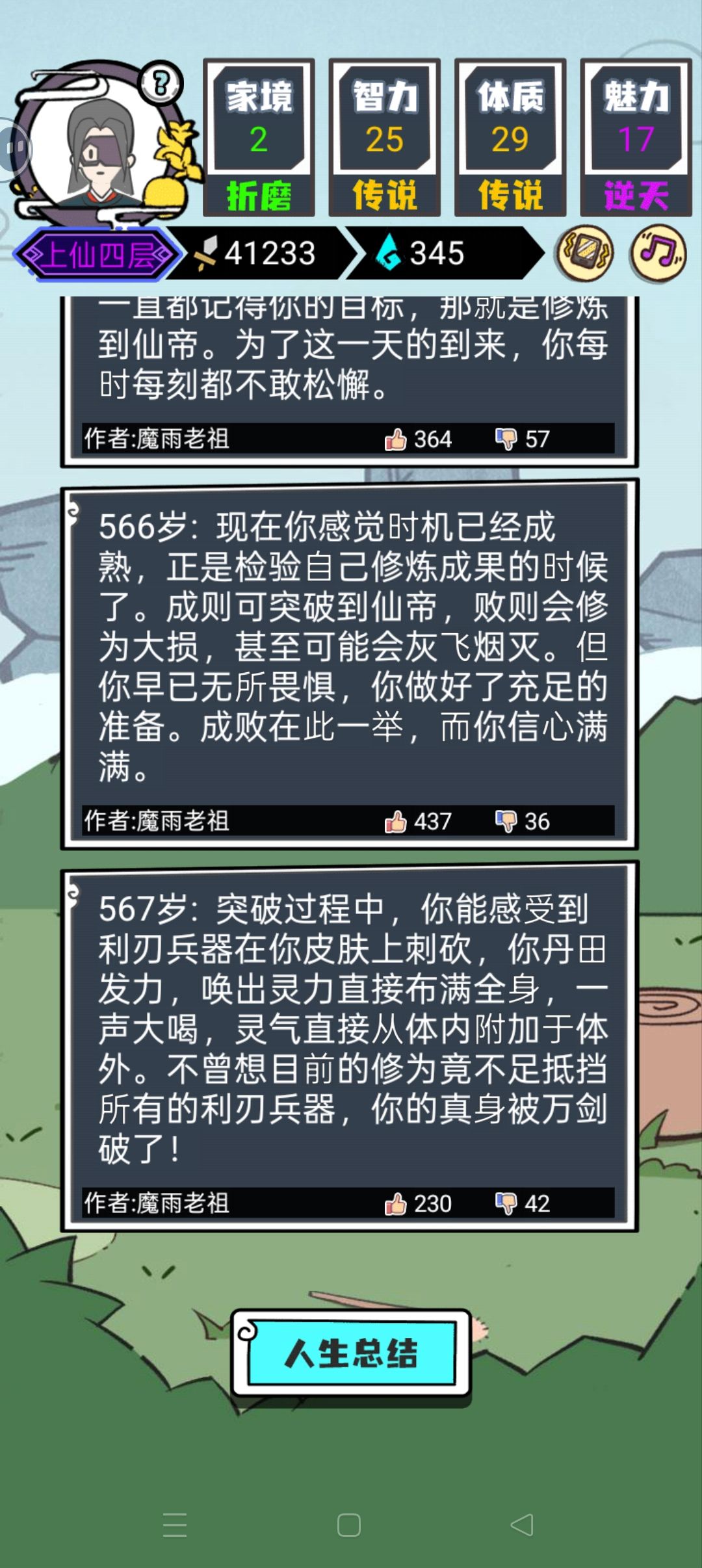 感觉还行吧,刚玩不会玩,第三局就纯瞎点500多岁到了上仙,中间遇见n个老婆没一个成的😂,真的这游戏广告看不看一个样,因为剧情完全随机,有可能你看了n个广告全是金色传说天赋他都能给你来个小时候喝水呛死....