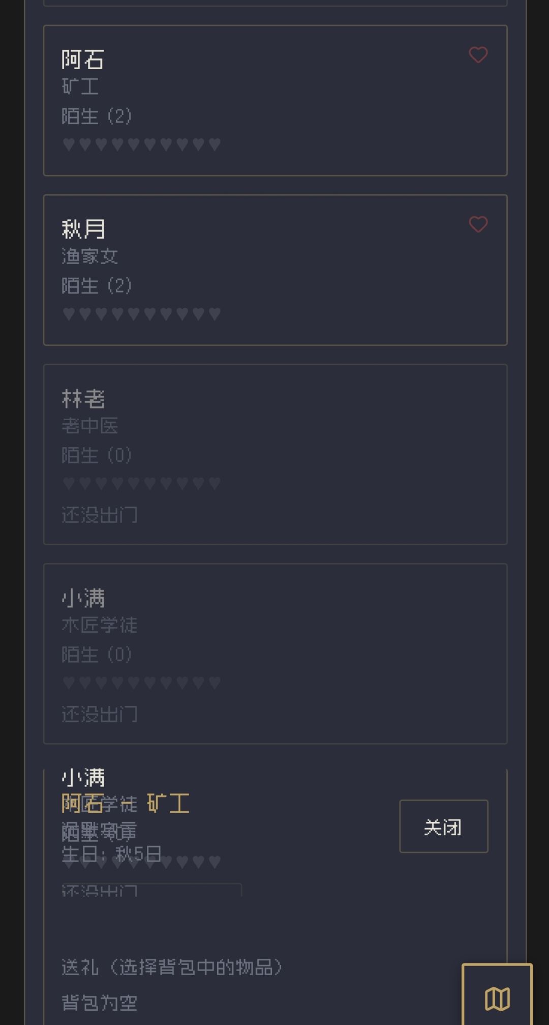 刚接触,bug有点多,等作者改完修改评价,桃源村部分人物框显示不全,人物信息点出来后文字有明显重叠部分。时间用光没有提示直接跳转第二天,钓鱼居然一次2小时,而且看下背包,重新去溪流居然要花时间。种植的种子收获以后,居然不用下新的种子能直接继续种,这个我不知道是bug还是啥。