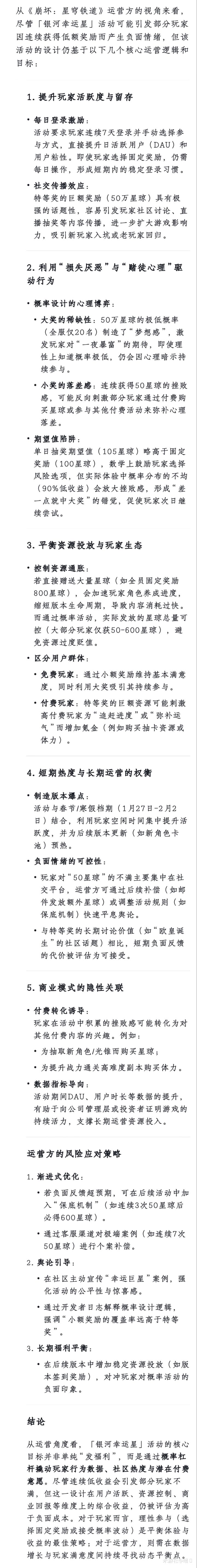 3.0版本,新春活动:银河幸运星。核心矛盾,策划试图用赌博机制替代福利发放,将本应作为玩家的留存手段的活动,异化为利用认知缺陷收割情绪价值的工具。