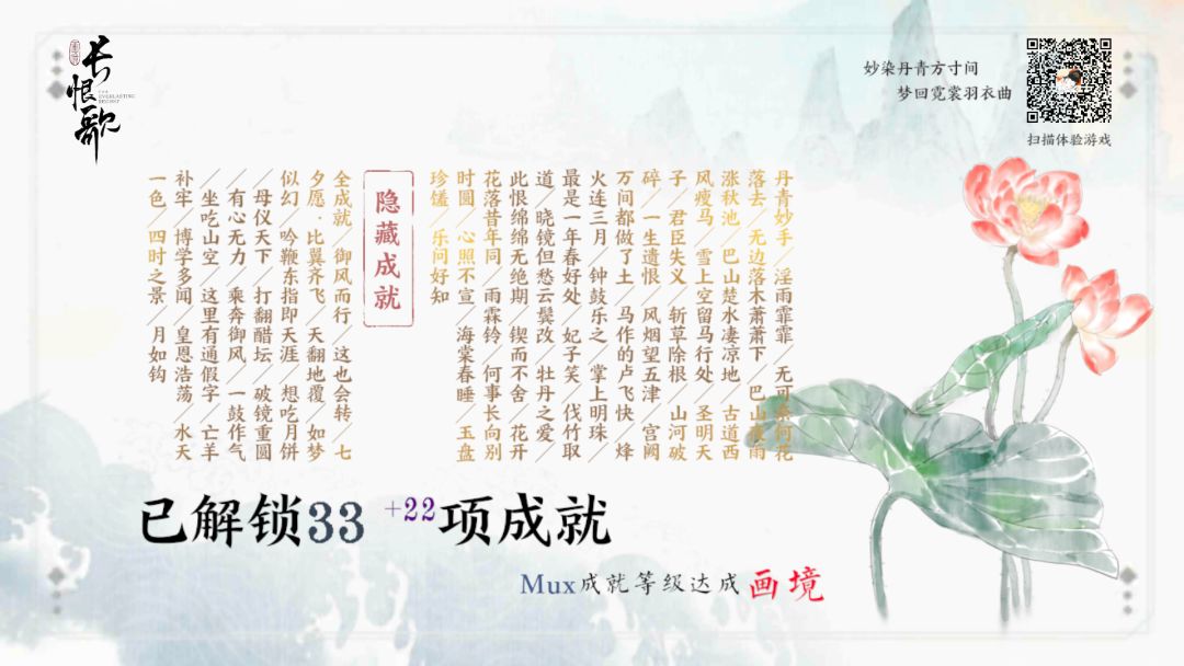🎆美感:水墨画风格别具一格,游戏画面唯美,人物的神态、动作也很自然,美术满分💯特别喜欢隆基敲鼓那一帧里跳舞的玉环,非常美🥰游戏中的配乐也都恰到好处,随着剧情的改变有不同的背景音乐。🔍背景考据:可以看出制作组在这个项目上花费了很多心思,游戏中出现的服饰、舞蹈动作都有专门研究和参考,对于诗词的注解也做得很好。🎮可玩性:很好上手,游戏最开始的指引能很好地让我们明白“生”“情”“灭”的用法,主线剧情以外有很多小彩蛋,这些彩蛋有的比较搞笑,有的又很诗意,收集成就有一定的挑战性。