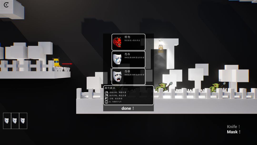 游戏中有3种面具,第一种面具触碰到敌人后让敌人暴走向前行走,第二种面具是让敌人周围的敌人向敌人自身聚拢,第三个面具是让敌人周围的敌人远离敌人自身,游戏左下角是玩家剩余的面具,游戏中飞镖的数量没有限制,飞出后碰到敌人也会继续运动,敌人被碰到后会在一段时间后爆炸,游戏里还有些场景物品可以互动,比如油灯,击中后会掉落到地面爆炸,游戏整体的关卡设计并不是很好,投掷也有问题,没有按照箭头所指示的方向投掷,在箭头比较低的情况下出现。蓄力以及抛物线也并不是很好。