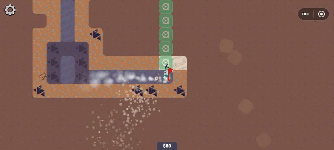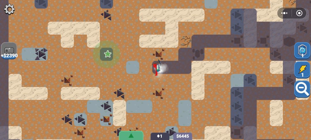 纯2D美术效果,界面结构简单,整体功能量不多。角色造型是红色火柴人,背上背着飞行背包,不用考虑燃料问题,可以自由在地下和城镇穿梭。挖矿美术表现较好,同一个地块有多种裂痕效果,连线意思表达也比较准确,很好理解。
