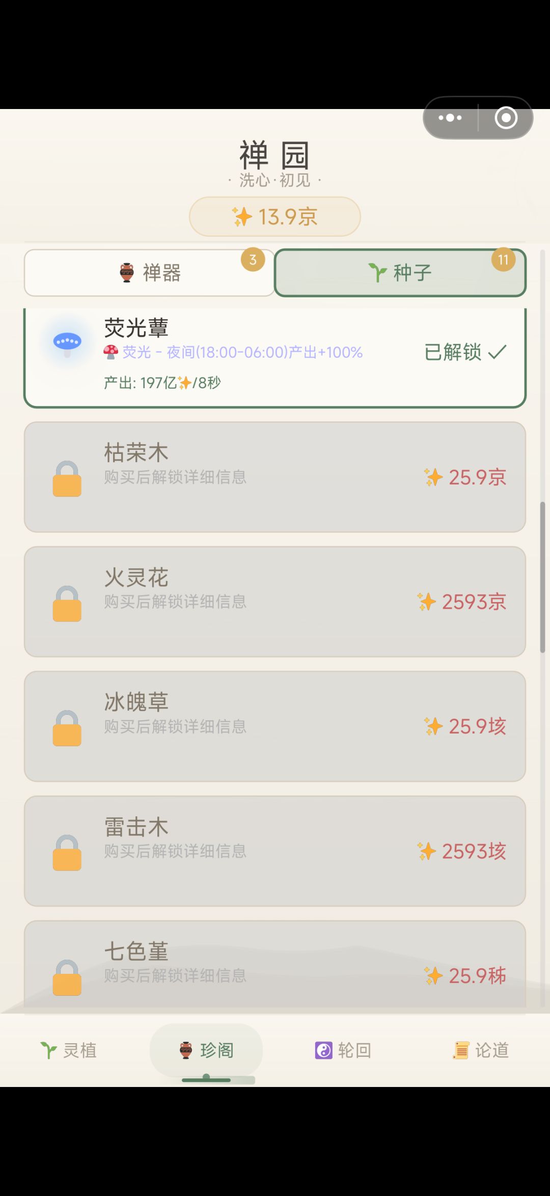 b.禅器和种子没解锁看不到详细信息。变成可以看到即将解锁的信息,如:我解锁了‘荧光蕈’后,可以看‘枯荣木’的部分效果,但‘火灵花’之后的种子都看不到信息。