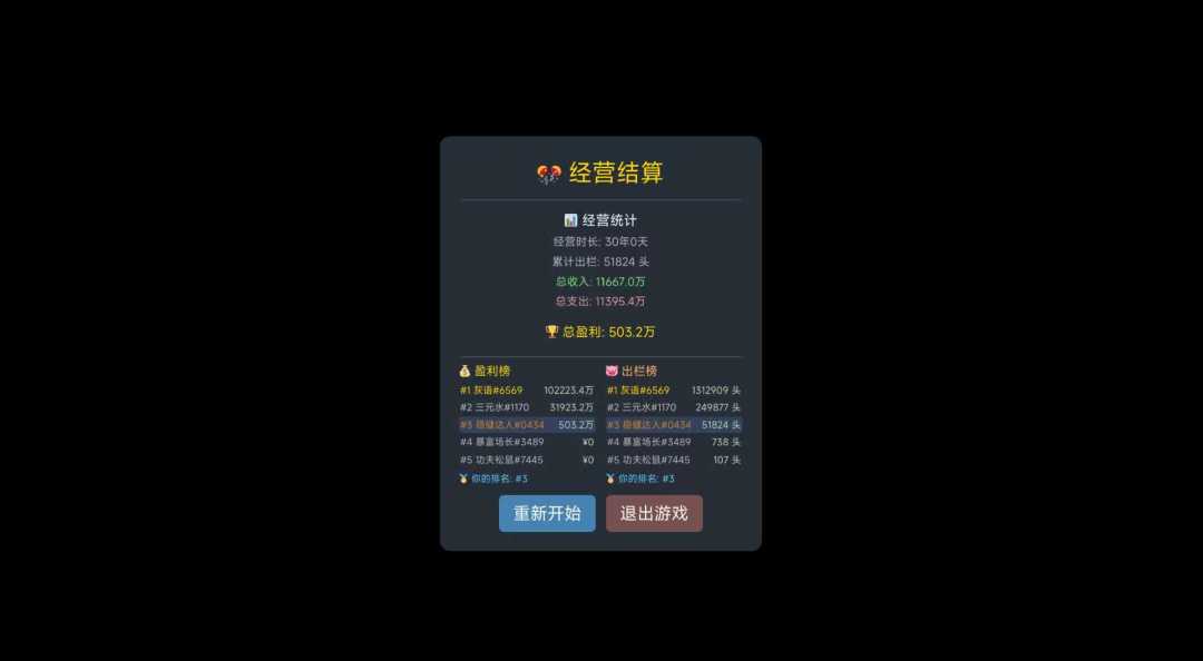 这游戏让我对一个完全陌生的行业有了切肤的理解。能把“养猪”做出策略深度,还敢让玩家真真切切地亏钱——这种创作态度,比那些一键满屏光污染的无脑爽游要好很多。期待作者之后挑战餐厅模拟器、便利店经营,我已经准备好继续破产了 🔥