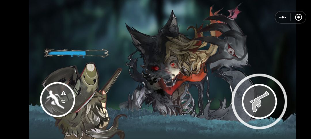最终幕小红帽显出真身,是很漂亮的巨型狼。看起来真的有点像小红帽一样。手臂上还有眼睛,很不错的设计。屏幕左下角闪避躲开狼的攻击,屏幕右下角猎枪出击,有时候需要两边一起联动。