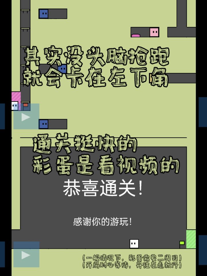 6.关卡流程比较短,熟练的玩家能够很快通关,卡关的玩家可能需要二十多分钟才能正常通关,遇到扮演黄块跳粉块的时候,其实有卡关过,后来才发现下面有管道能够控制另一个黄块不踩按钮...