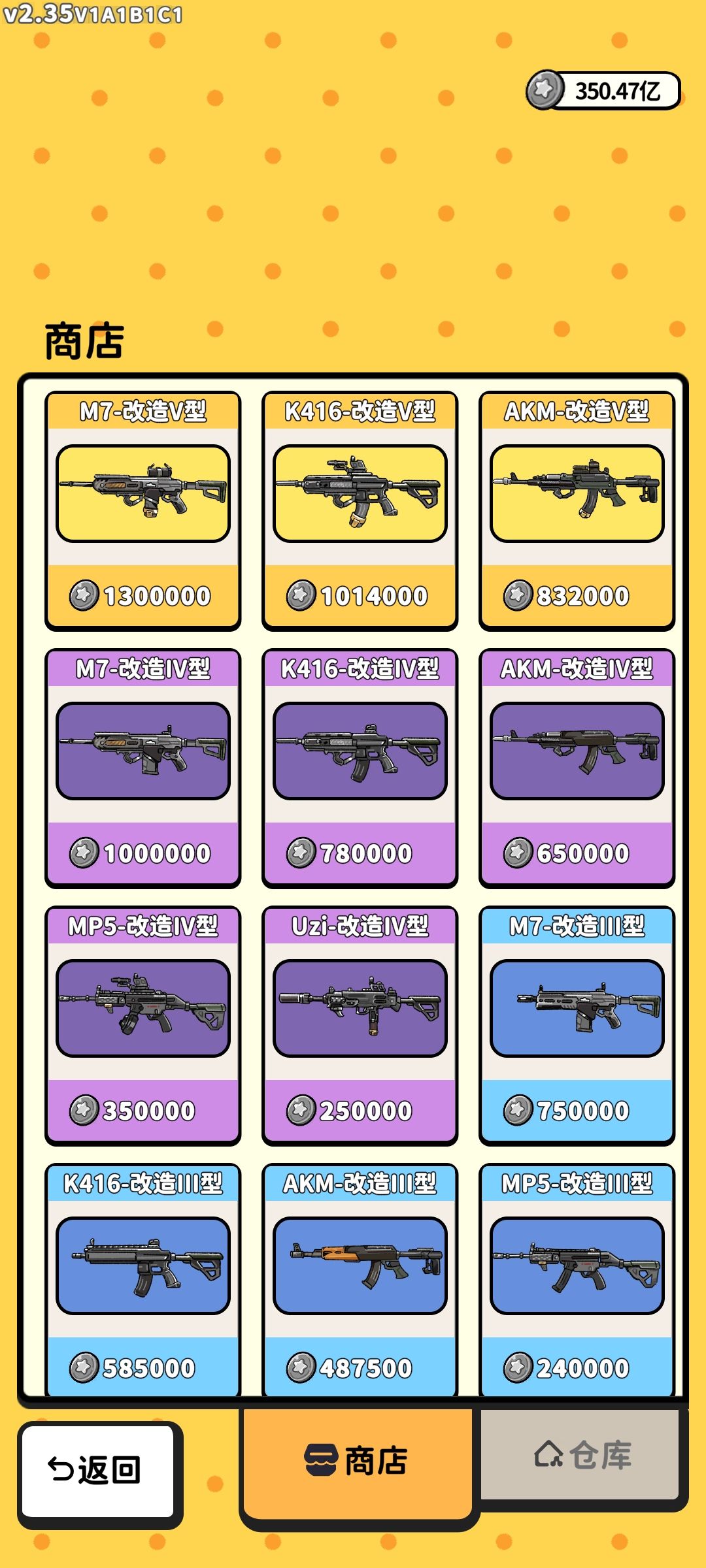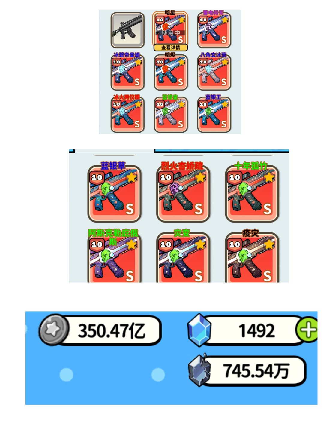 枪械:已经从最开始简陋的两把玩具枪进化到现在的正常模样了,现在已经有了k4的皮肤,满级神话加成相当牛掰,拥有一把基本可以过上养生生活(未来会推出霰弹枪,狙击枪,及其他枪皮可以敬请期待了)