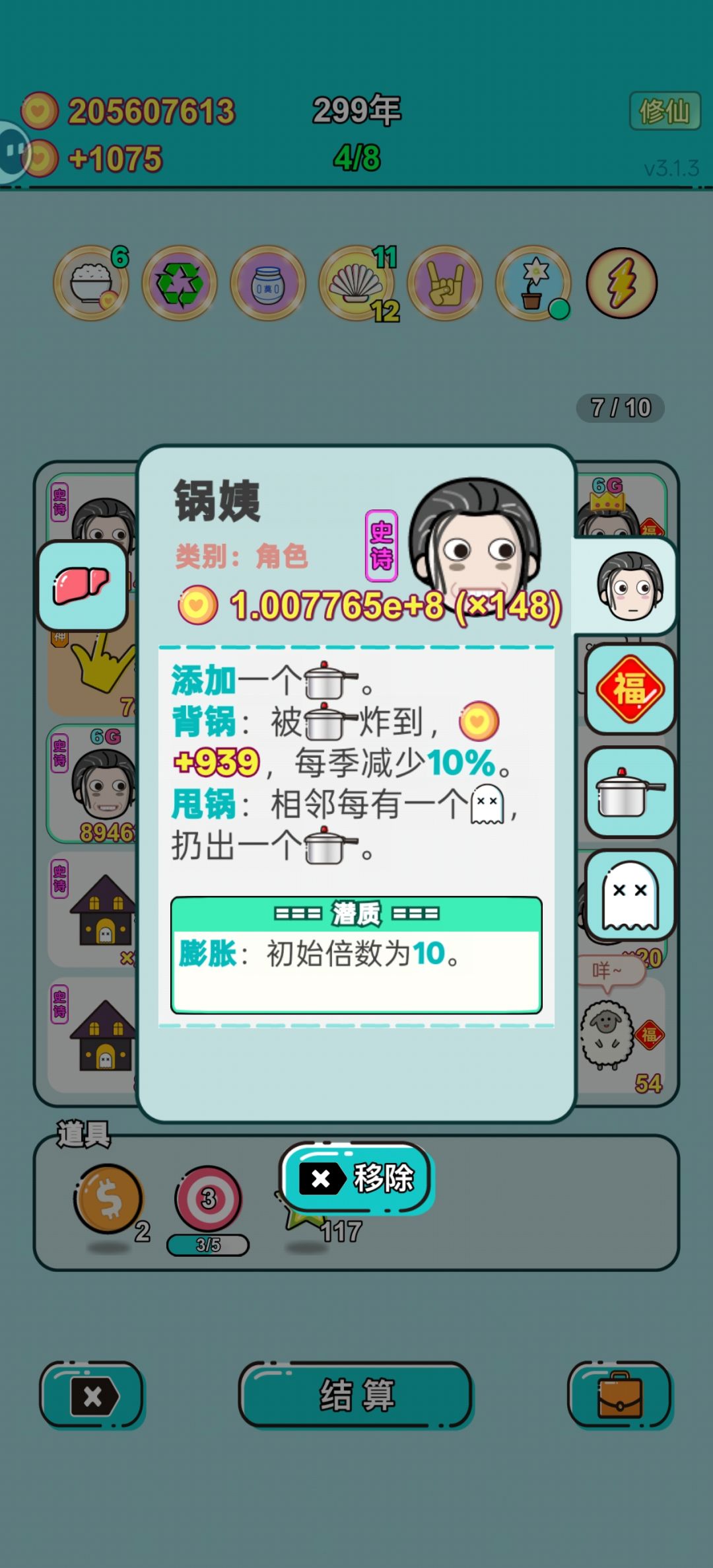 总体来说,这个游戏还是蛮上头的。到了后期金币都已经10亿➕了,感觉越玩越好玩哈哈哈哈哈。音效也很上头,那个锅姨加上金手指,加上复制,加上鬼,或者那个兔子,他后期的金币输出就特别大,真的巨多钱我的天。一直炸炸炸的我弟被我吵的都睡不着觉了哈哈哈哈哈