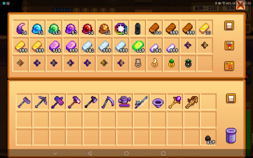 目前自己第一个档完美后依然在玩,装修不太考虑美观也还算过关(目前尚未完工),作为一只小仓鼠也是囤了不少杂货,为了方便忍痛卖了一堆金属锭买黄金时钟,跟科罗布斯相处得很好(感觉小黑善良得让人心疼);打算开新档的话请记得,游戏理解深刻了也不要太死板,各行各业喜欢什么做什么,能达到给自己定的小目标就好。