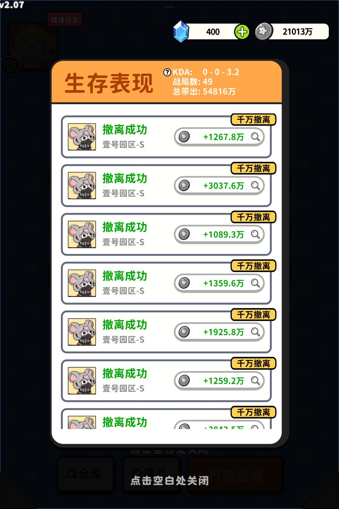 经验干货:这个游戏的重点在于搜,人机会自动搜出来物资,而且不会放保险,最后把剩下的几个人机砍掉就能差不多把全图的物资全部收完,玩家主要是开钥匙房,人机是全部没有钥匙的,而且人机不需要特地去抓,只要拉闸大部分人机(红狼,因为基本上风衣是活不到拉闸的)都会往撤离点跑,最好是每把都清完图再撤离,(人机有时候会不知道为什么原地暴毙,应该是bug)大家看一下我的战绩截图就能知道前期和后期的区别了(第1张前期,23后期)可以看出来后期基本上可以连十凉又十几把,而且把把千万