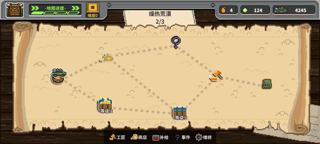 地图前进是经典肉鸽分支结构,无法走回头路,随机事件种类丰富,也有BOSS战斗。在完成一次战斗后,也有三选一对炮塔进行强化。在地图强化节点内,可以对炮塔进行三选一强化,晋级方向有差别,有选择流派策略。