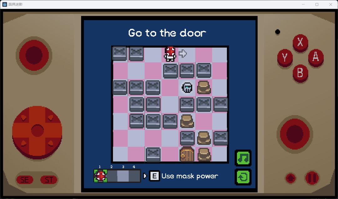 游戏界面很复古,像早年的游戏机,目前版本一共8个关卡,内容不多,大概20多分钟就能打通。玩家操纵的角色可以上下左右移动,E键是使用能力。游戏共有6个面具,分别是喷火面具,跳跃面具,像苹果核的激光面具,像头盔的推铁面具,像十字军头盔的叉字型激光,像溜溜球模样的可以旋转三角镜面。注意旋转三角镜面可以以90°的角度反弹激光。