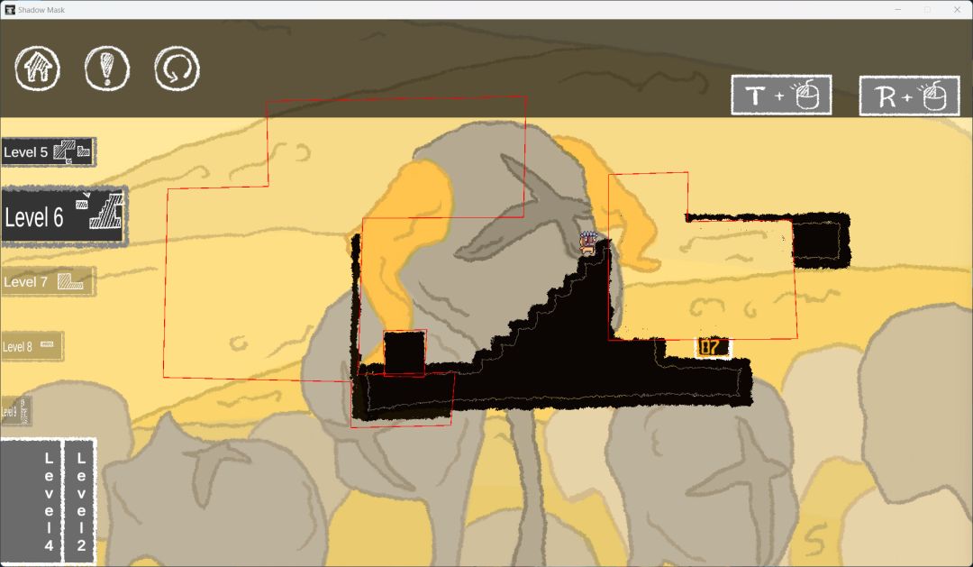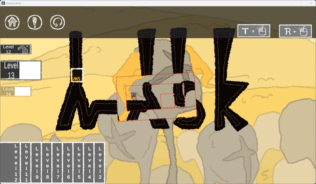 游戏的玩法也很简单,左下角是蒙版,用鼠标将他们拖出来,然后按T的同时拖动鼠标就可以对蒙版进行平移;按住R键的同时移动鼠标就会实现蒙版的旋转,巧妙利用这两个操作就可以得到非常有趣的解法,这两个重要性差不多,一些横着的地图最适合旋转通关法,一些平台都是自然而然出现的。当然游戏还有变种,那就是你根本看不到通关的石碑在那里,但是只要利用蒙版,就可以从原本空无一物的地方找到被隐藏起来的石碑,然后再适当调整一下蒙版的角度和方向,就可以搭建一条捷径,通往下一关。