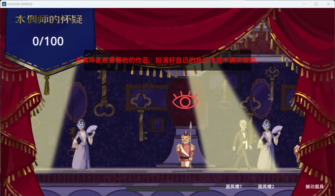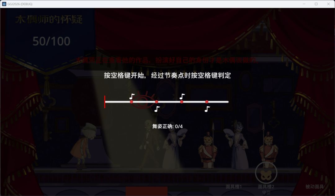 当然也不是说我们一定要在10次之内刺杀木偶师,这个是很难做到的,但是我们可以刺杀其他木偶获得他们的面具,当遇到警告提示的适合可以按下鼠标左键戴上对应的木偶面具,这样就可以成功打消木偶师的怀疑。木偶分为舞者木偶、护卫木偶、管家木偶和公主木偶。这里面舞者木偶最特殊,因为使用它会有一个关于空格的“QTE”判定,全部成功后就可以使用。玩家最多可以持有两个主动面具和一个被动面具,不过警告的频率很高,手中完全不会超过两个面具,因此不用担心。