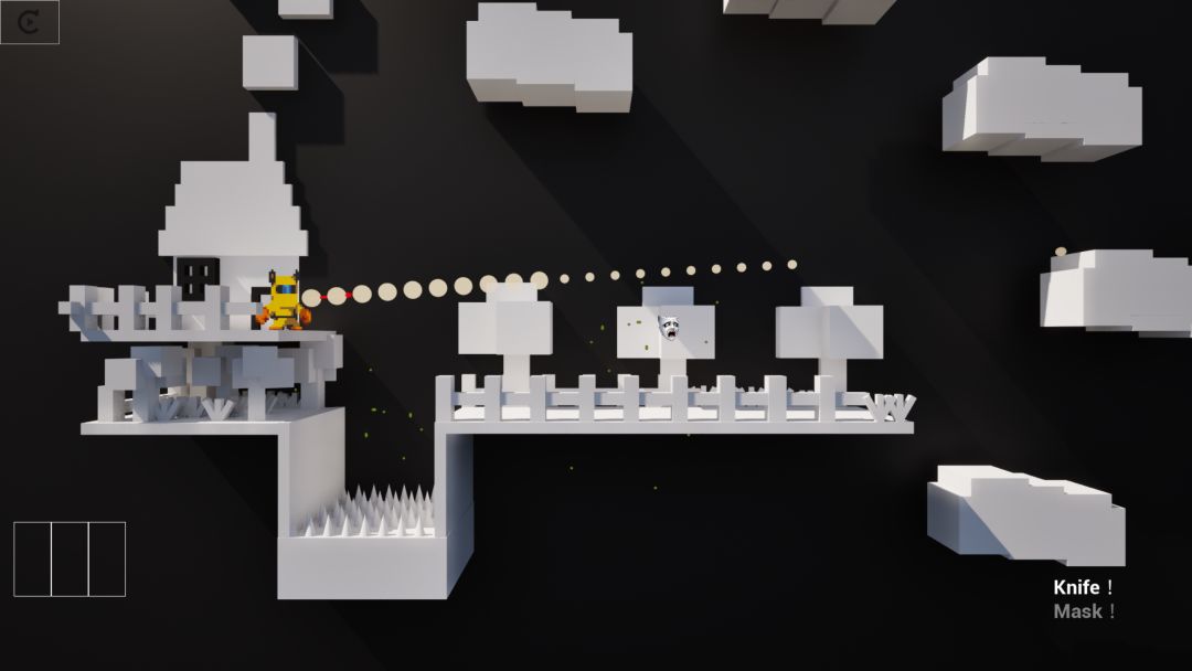 面具有三种,分别是愤怒、悲伤和恐惧,愤怒可以给敌人施加狂暴状态,然后爆炸,爆炸后狂暴可以传染给周围的敌人。悲伤是聚怪,敌人会抱团。恐惧是让人远离被面具击中的怪物,这个可以直接掉进尖刺陷阱或者悬崖,还挺有趣的。面具没了的话可以切换飞刀攻击,击中敌人就可以引起爆炸。有一关是直接给满了面具,那场面是真的大气,从来没打过这么富裕的仗。