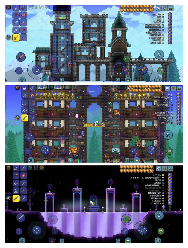 建议③ 功能性建筑,包含战斗平台,刷怪场,钓鱼池,植物种植园。先讲平台,丛林地下和海洋是必须要有的。丛林地下的战斗平台一定要在肉前做,鳄龟和巨骨舌鱼,蹦蹦兽的伤害很高很高(肉后丛林敌对生物)经常把穿毕业套的我几下秒了。刷怪场就不多说了,肉后怪物掉落的东西很多都是有用的,最重要的,暗影之魂和光明之魂,如果刷怪场刚好被腐化猩红或者神圣传染了,那就不用费时费力去找相应怪物了。钓鱼池和植物园,属于是辅助,肉后钓鱼能获得的东西也没啥值得一提的。但是定点多生态鱼池是可以了解一下的,各种论坛和视频流媒体都会有详细教程。建好了可以让你足不出户钓到渔夫想要的任务鱼。植物比鱼池重要,各种战斗药水挖矿药水都要做。有减伤的加暴击的,有发光的矿透的,有了药水对游戏体验非常好。可以在wiki百科查询各类草药的种植,成熟习性。