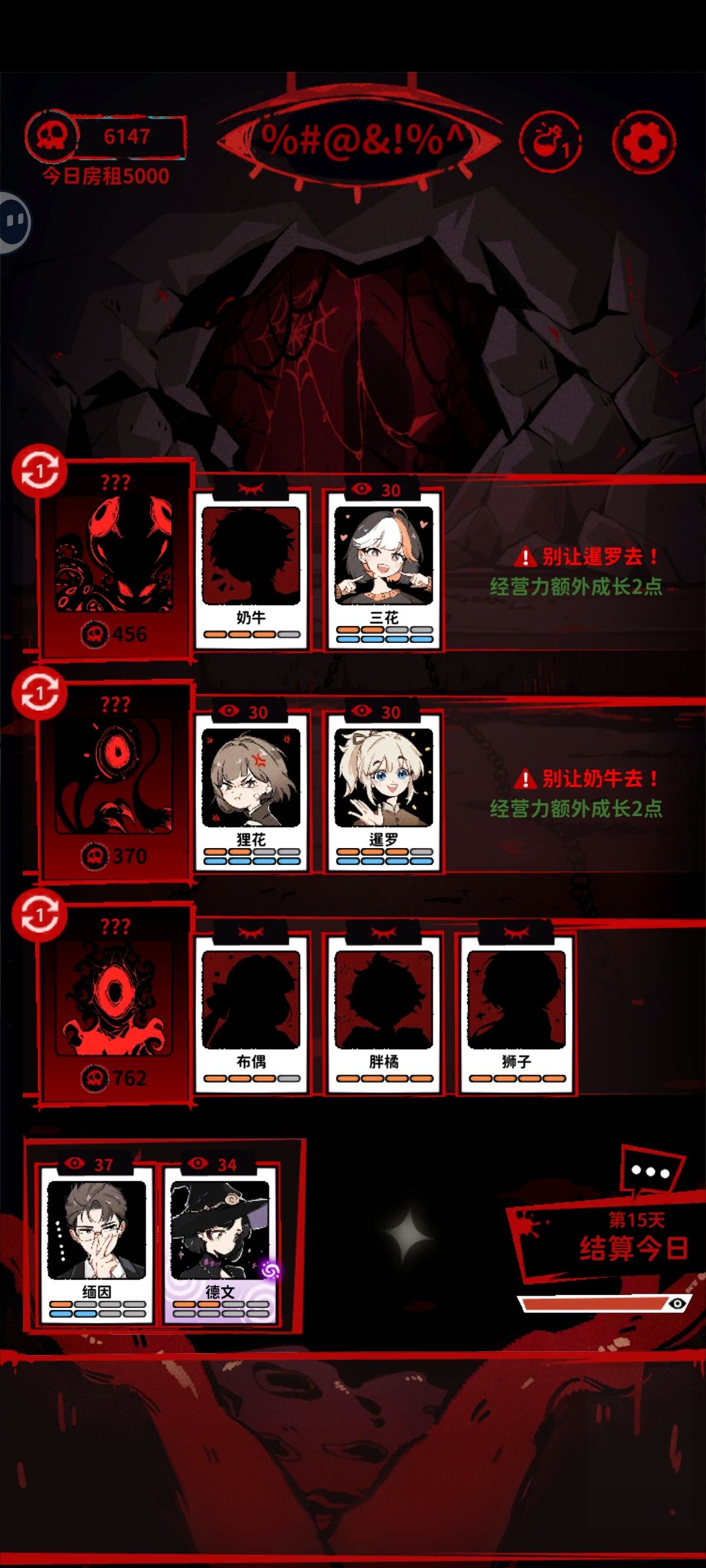 触发影子鬼之后的事情就简单了,把所有猫全部派出去(也可以留一个看不顺眼的先跟德文一起放在休息室)截个图,然后看看谁体力值不变(这里要注意狮子和里世界的词条)