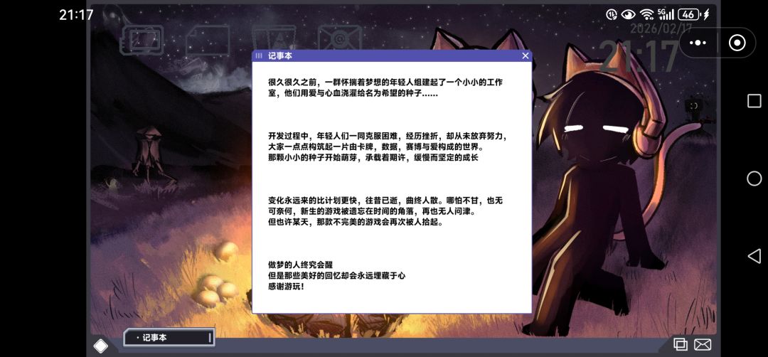 剧情方面,这是一个关于轮回的故事,关于主角(玩家)和猫猫(NPC、最终boss)在一个被作者抛弃的游戏中轮回寻找一个完美结局的故事。虽然直到最后,也未能找到,但就像游戏中说的,或许比起追求完美结局,和伙伴一起躺在草地上,围在火堆旁烤棉花糖,一边仰望星空,让这美好的一刻永驻,才是我们真正找寻的意义吧。