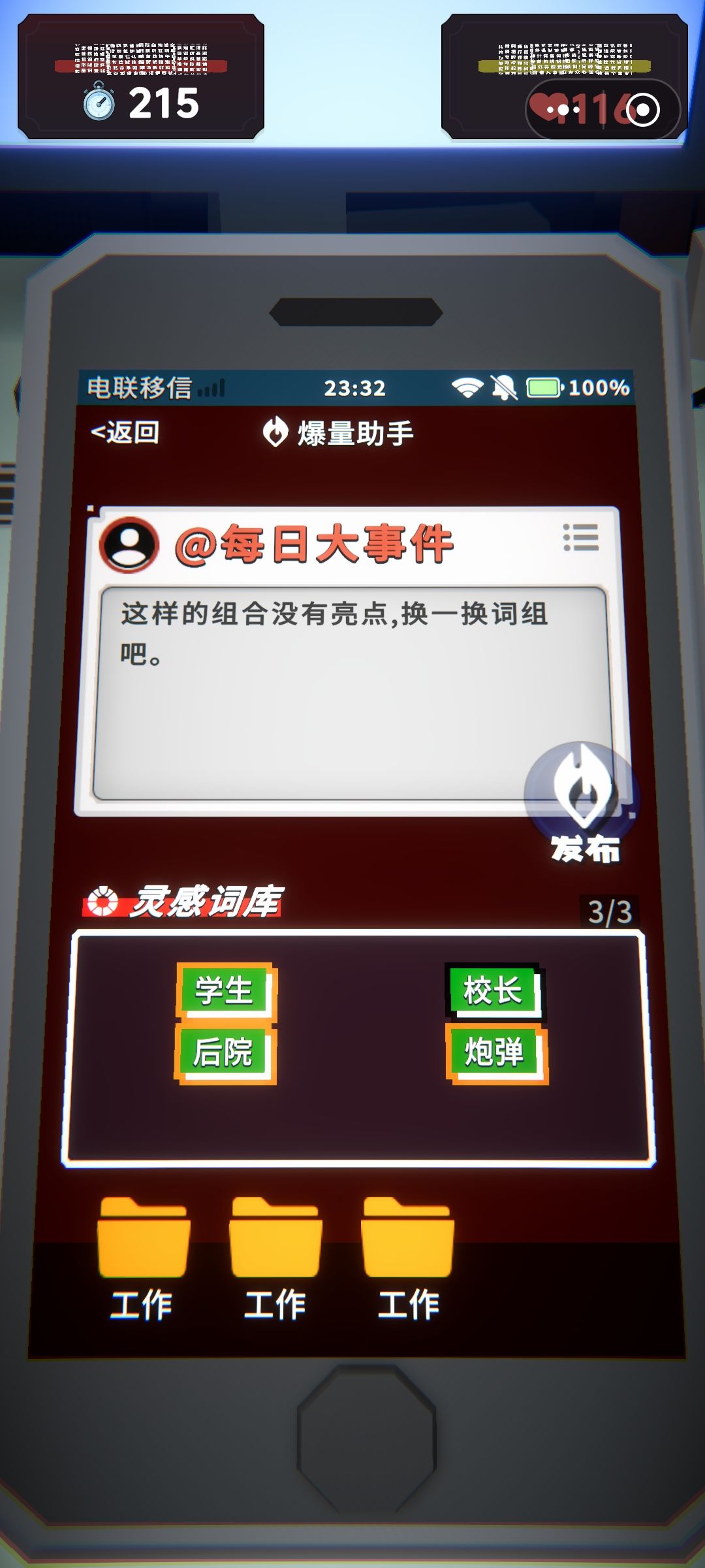 我想对作者说:我很喜欢你的游戏首先主角作为文案创作者,通过断章取义文章中的关键词组成令人惊奇的标题,这一灵感,本身就很具有讽刺性,让我想到现在许多标题党。但有所升华的是,这又不止是对行业乱象的讽刺,更是让人跳过文章背后的写手,直接审视让他们所有人成为绩效奴隶的——扭曲的工作制度。其次,有关同事的转折非常感人。