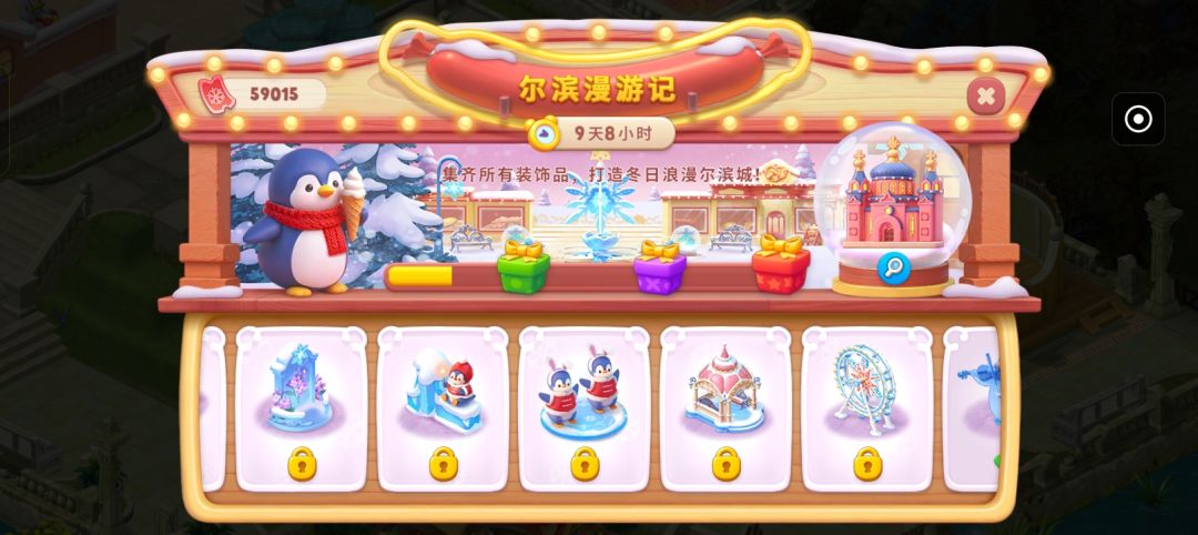 顺便一提 我真的很喜欢哈尔滨这个活动 真的真的特别喜欢企鹅 可是我的瀑布没有装完买不了 希望官方可以不限制没解锁区域物品的购买 到时候解锁了再装修上 不然过几天开学了就又错过了 而且老是卡关 想赶紧装完都不行 这几天都不知道买了多少无限礼包了