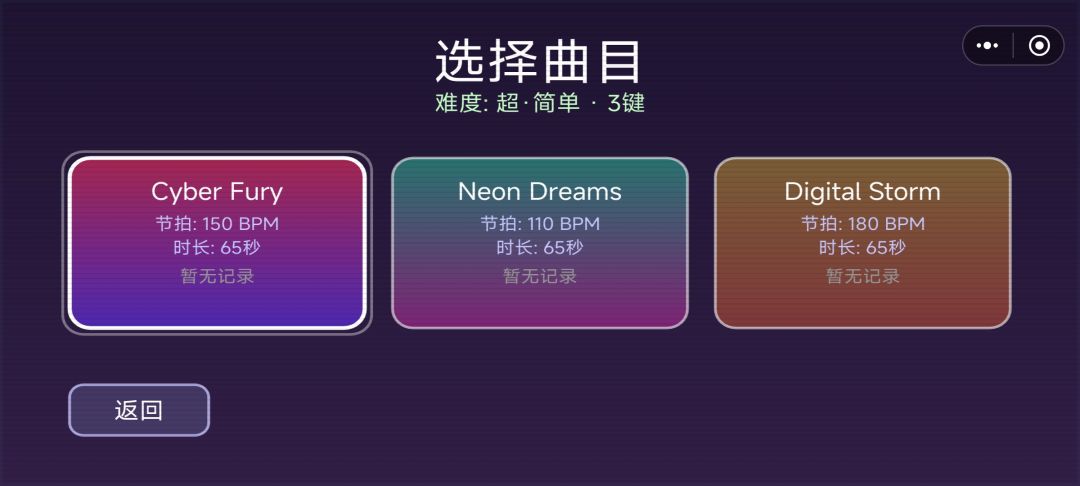 曲目只有三个,因不同难度而形成不同游戏体验,每个难度下的曲目分数单独计算,分数仅作为自我挑战的目标。